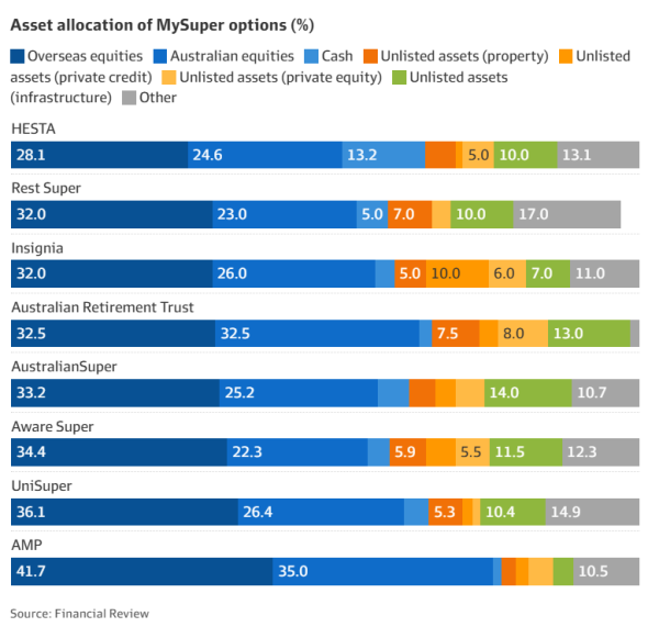 Super funds already invest heavily in overseas markets as they outgrow the ASX and local unlisted opportunities. Global equities account for more than a quarter of most of their portfolios, and a sizeable portion of their unlisted property, private equity, infrastructure and debt holdings comes from offshore too.